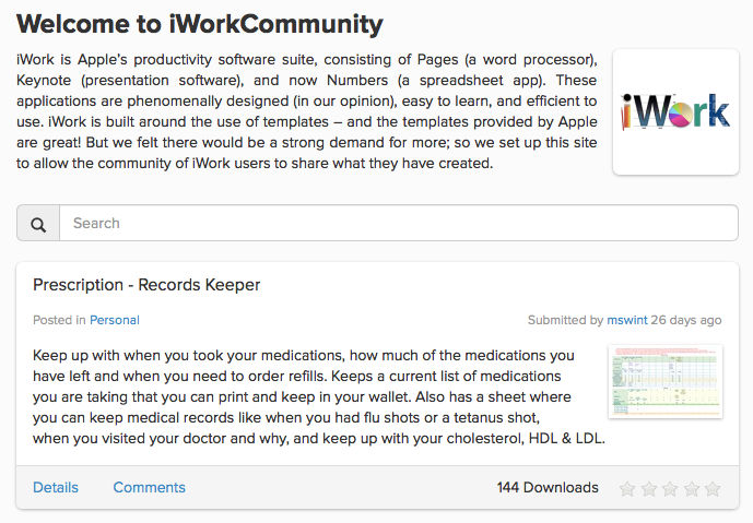 iWorkCommunity.com is a popular template site for users of Apple's iWork suite (Pages, Numbers and Keynote).